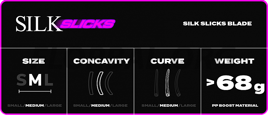 Nová revolučná čepeľ SILK SLICKS – najjemnejšia čepeľ SILK je teraz vybavená technológiou SLICKS! Hodvábne hladký materiál PP Soft (PPS) v kombinácii s klzkým materiálom PE tvorí perfektné spojenie pre rýchle a hladké ovládanie loptičky. Technológia SLICKS z PE plastu poskytuje lepší sklz ako pri bežnej PP čepeli na každom povrchu, pričom zachováva jemný a citlivý kontakt materiálu PP Soft.