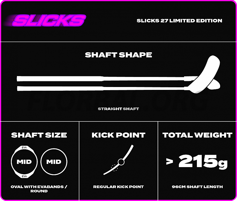 Stredne tenká a ľahká palica FAT PIPE SLICKS zo 100% karbónu as novou čepeľou SILK SLICKS. Tvrdší shaft je ideálny skôr pre strelcov. Lepkavý grip STICKY.