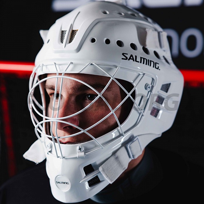Profesionálna florbalová brankárska helma Salming Phoenix Elite Helmet v bielej lesklej variante.